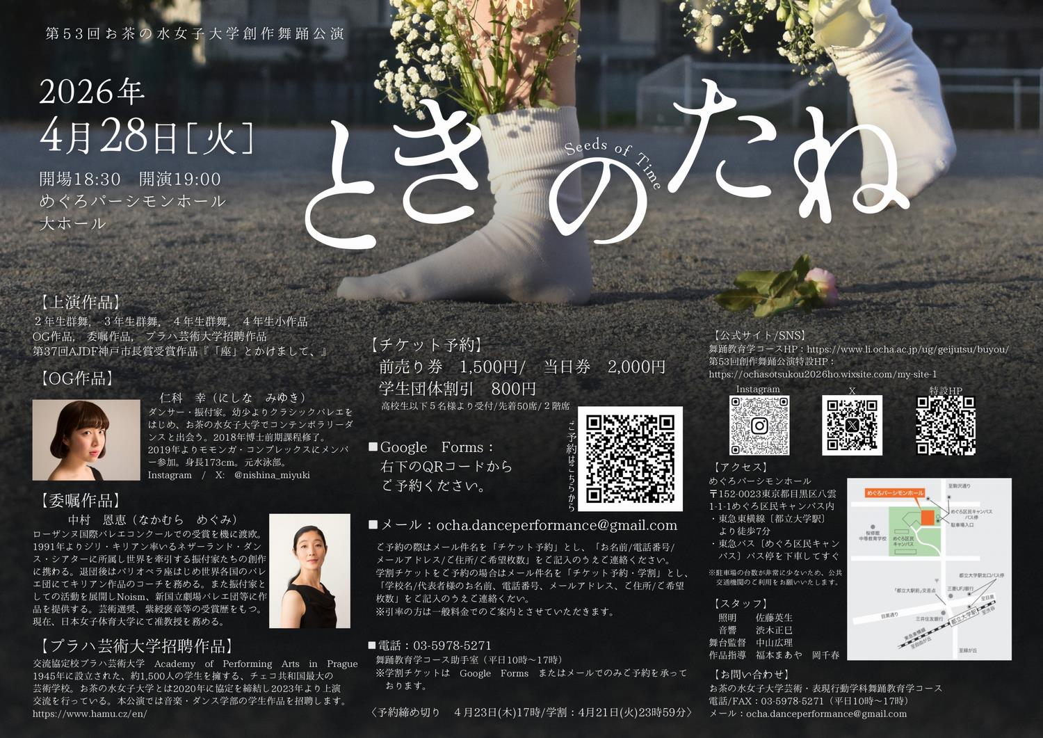 【Googleフォーム予約】 予約締切日時:4月23日(木曜日)17時 【メール予約】 ocha.danceperformance@gmail.com 件名を「チケット予約_一般」または「チケット予約_学割」とし、①代表者様のお名前、②枚数、③ご連絡先、④ご住所を明記ください。引率者の方は一般となります。 予約締切日時:4月23日(木曜日)17時 |